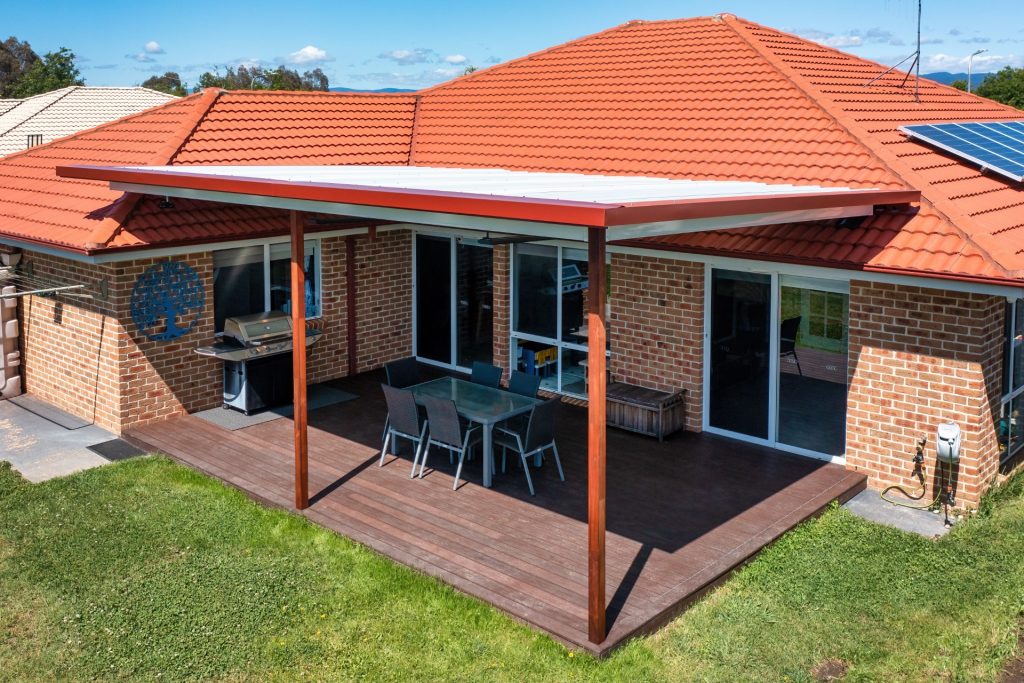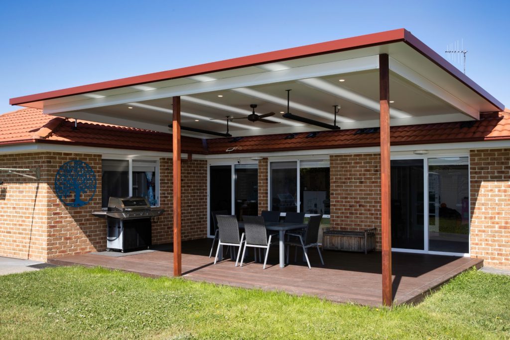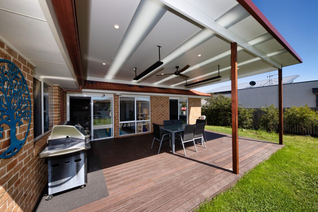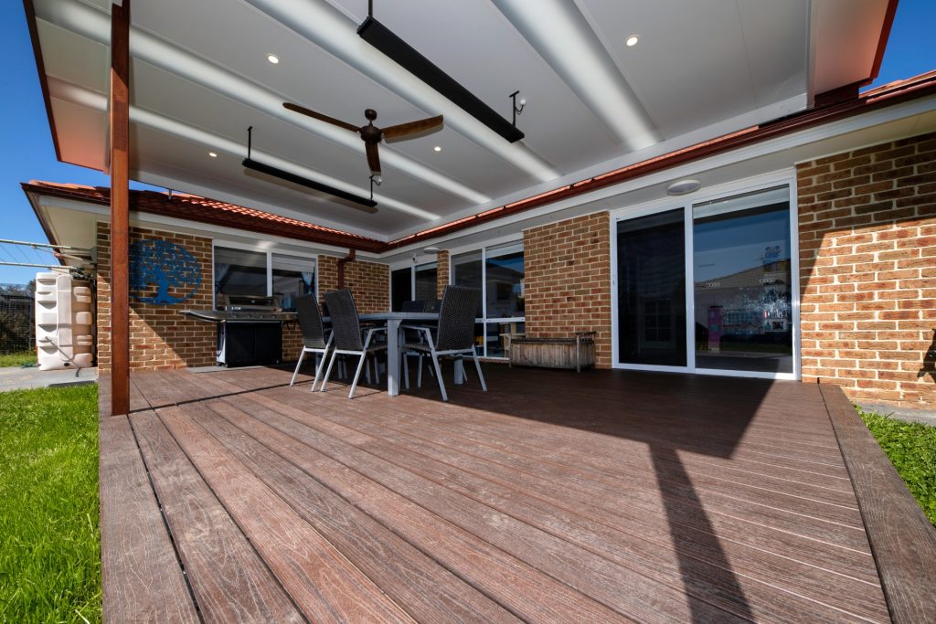The flat, insulated, Versiclad pergola with downlights, fan, and heater strips provides a comfortable and functional outdoor living space. The insulation helps to regulate the temperature, while the downlights create an inviting atmosphere during the evenings.